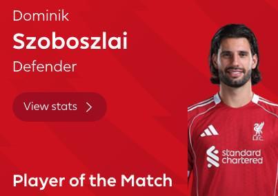 任意球破门,索博斯洛伊当选利物浦vs热刺全场最佳球员