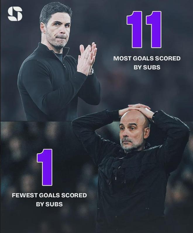 同时,曼城本赛季只通过替补球员打进了1球,是英超最少的。