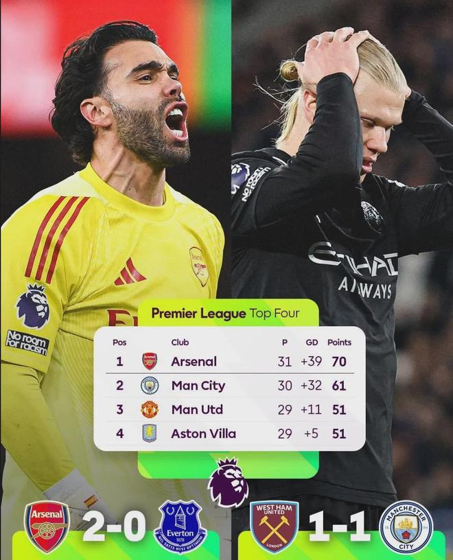 本轮联赛之后,阿森纳多赛一场已经领先曼城多达9分!