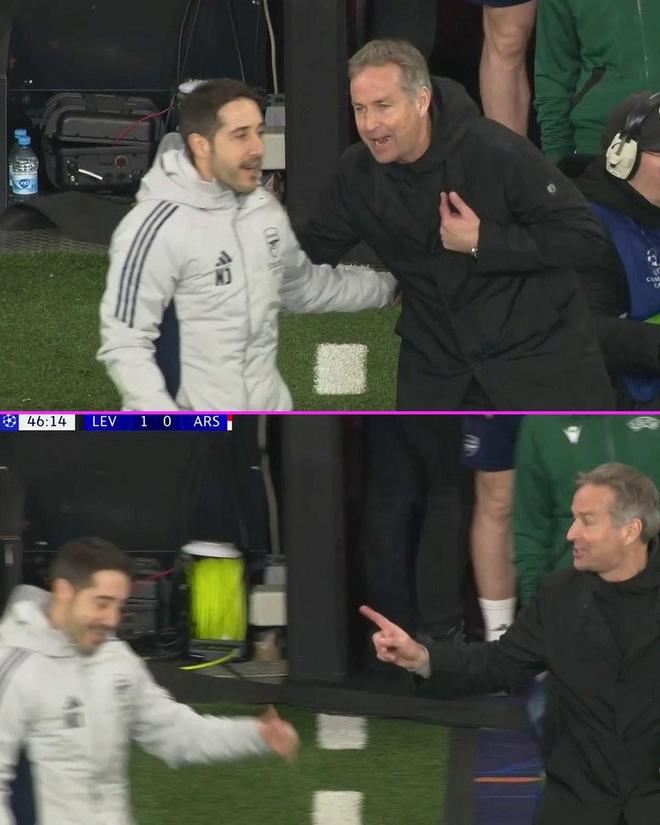 欧冠1/8决赛首回合,勒沃库森主场对阵阿森纳,在下半场勒沃库森通过角球机会取得领先后,药厂主帅尤尔曼德马上找到阿森纳定位球教练乔弗尔。