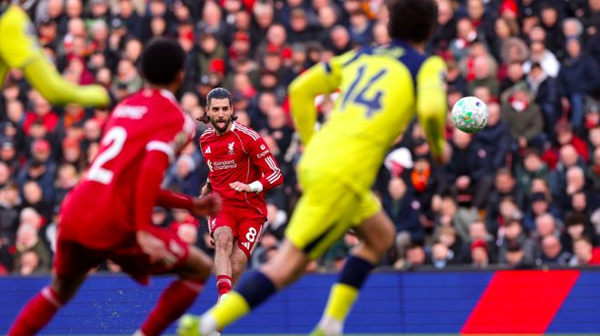 第18分钟,利物浦获得前场位置不错的任意球,索博斯洛伊再次秀出圆月弯刀,皮球绕过人墙,维卡里奥扑救不及,皮球应声入网。