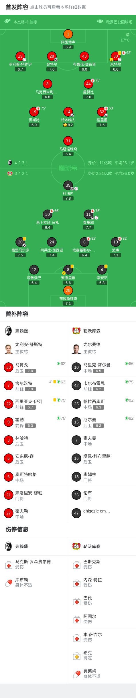北京时间3月7日德国足球顶级联赛 联赛 第25轮,弗赖堡主场对阵勒沃库森。比赛中京特尔助攻格里福先拔头筹,泰里耶助攻科法内推射破门将比分扳平,随后铃木唯人禁区推射完成破门,格里马尔多定位球直接破门再度使两队回到同一起跑线。下半场泰里耶调整低射近角破门逆转比分,比赛尾声金特尔禁区抢点头球破门绝平比分,全场战罢,最终比分弗赖堡 3-3 勒沃库森。