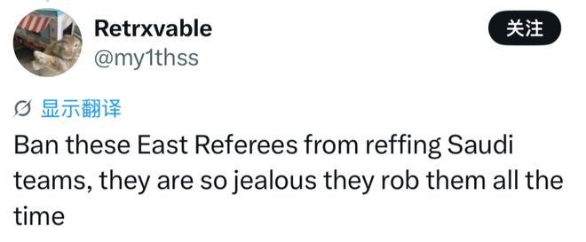 “中国裁判需要被禁止执法,他们没有资格执法任何亚洲顶级赛事!”;“应该禁止东亚裁判执法亚冠,他们嫉妒沙特联赛球队的强大,因为总是抢走他们的分数!”;“受贿且腐败的亚足联!”